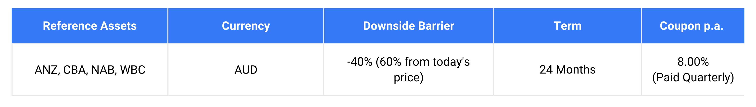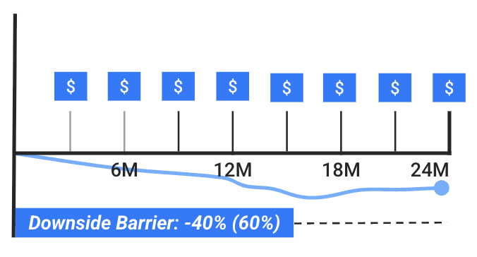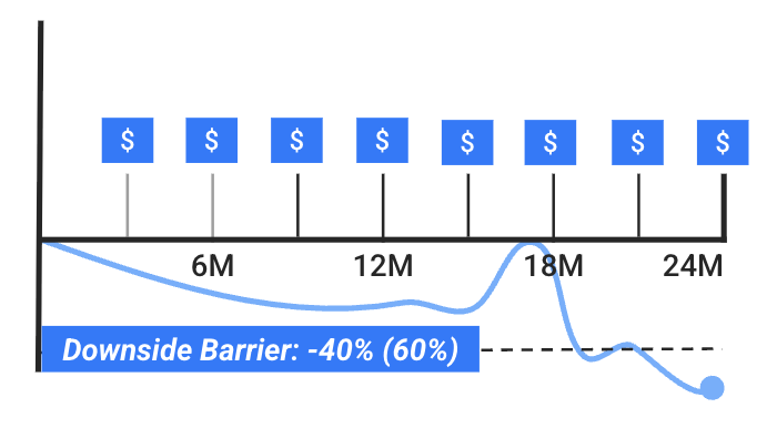 A Fixed Coupon Note (with Barrier) is a common variation of Barrier Income Note. It pays a fixed coupon regardless of asset performance1. Capital is secured as long as the reference assets do not breach the ‘downside barrier’ at maturity.